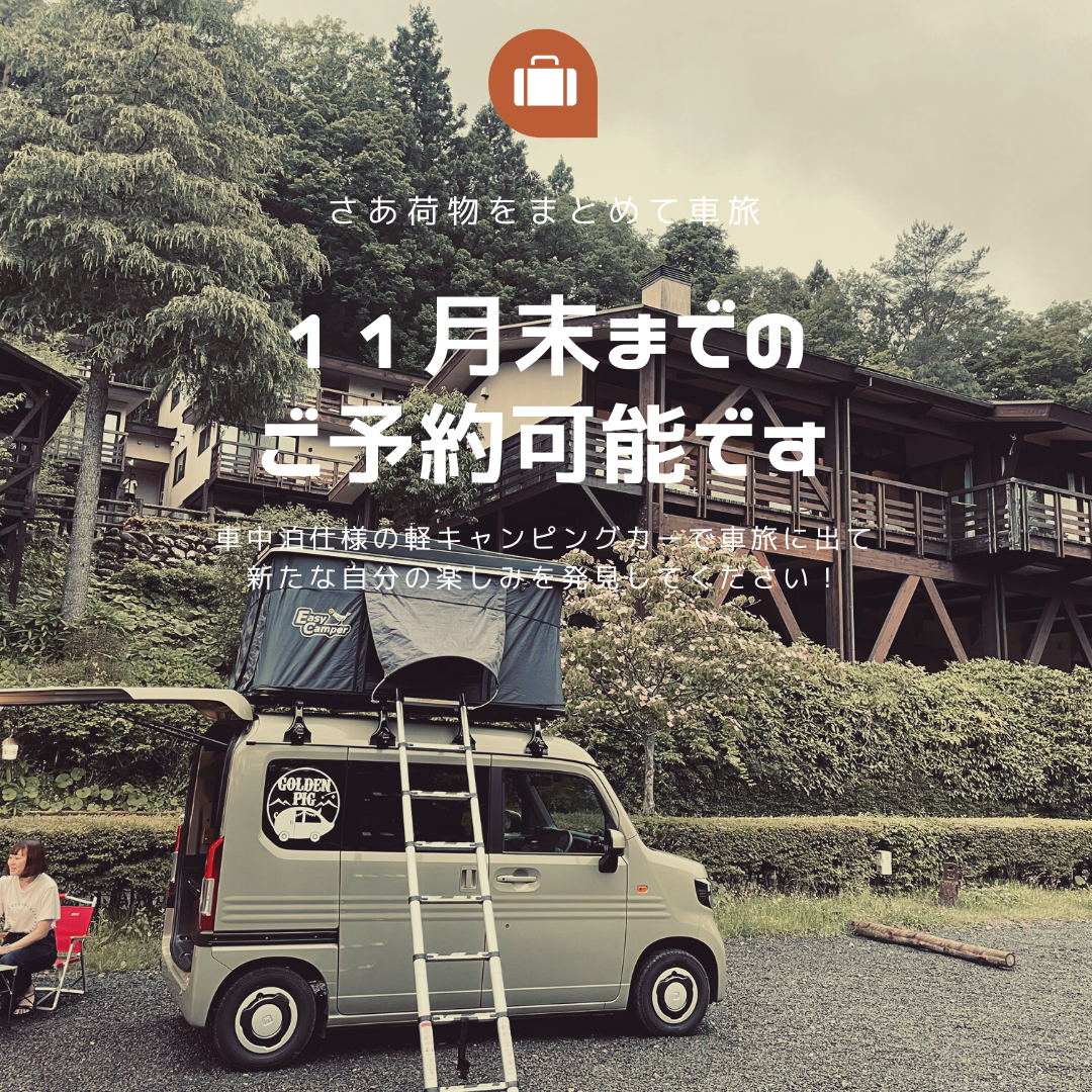 ゴールデンピッグの車中泊仕様軽キャンピングカーで車旅へお出かけください。