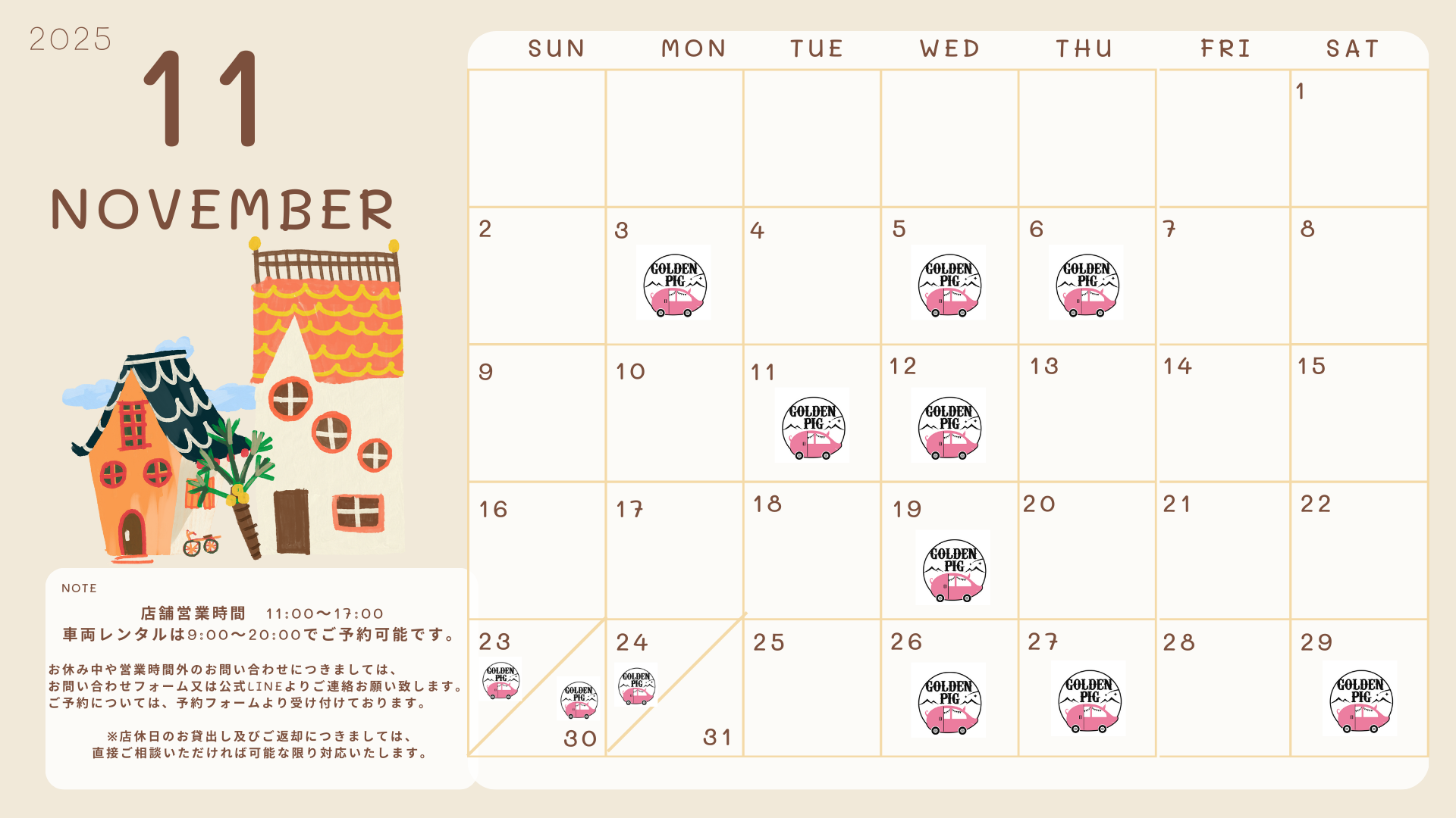 2025年11月の店舗休業日についてお知らせいたします。毎週水曜日の定休日のほかに下記の日程がお休みとなります。