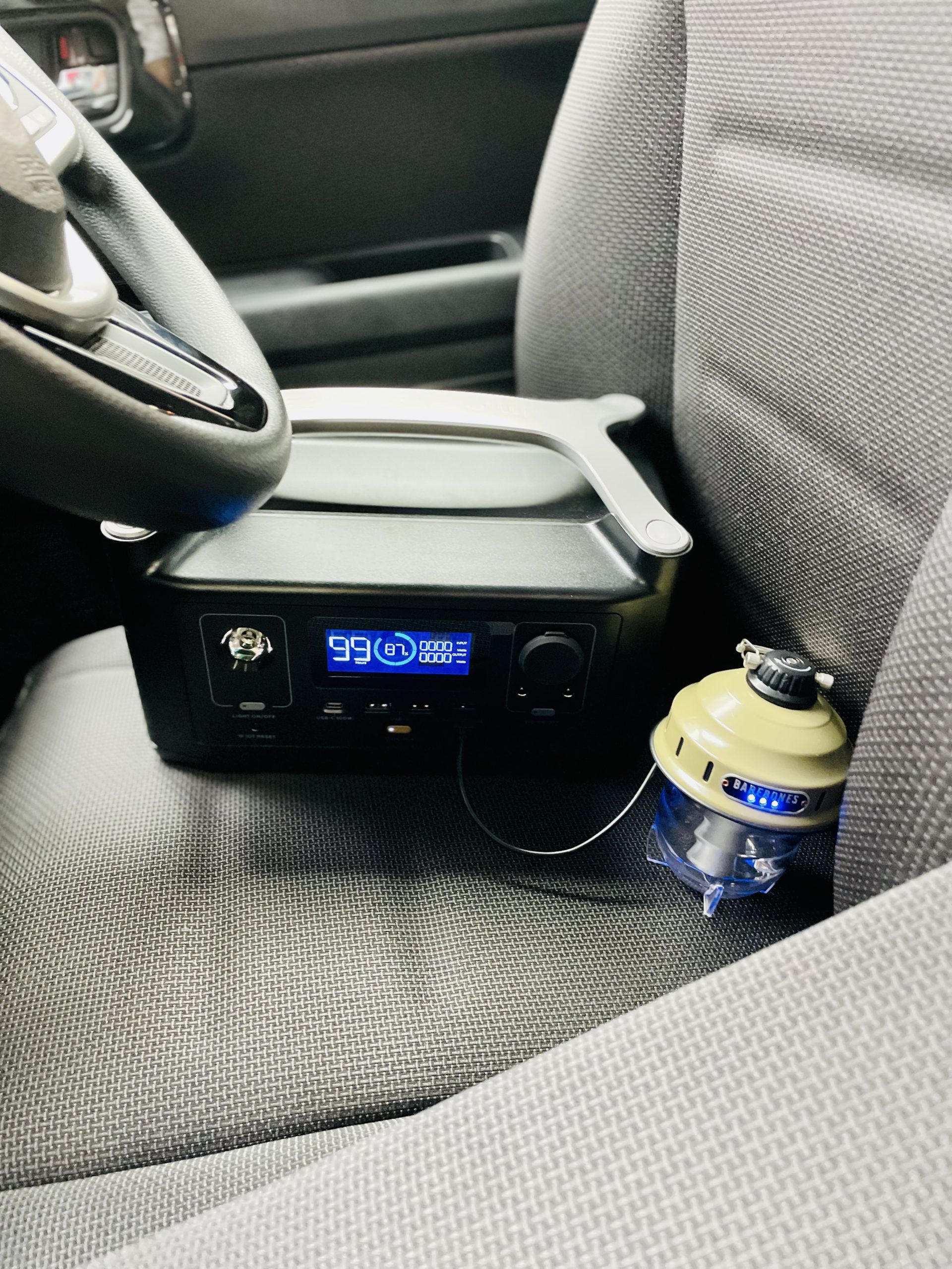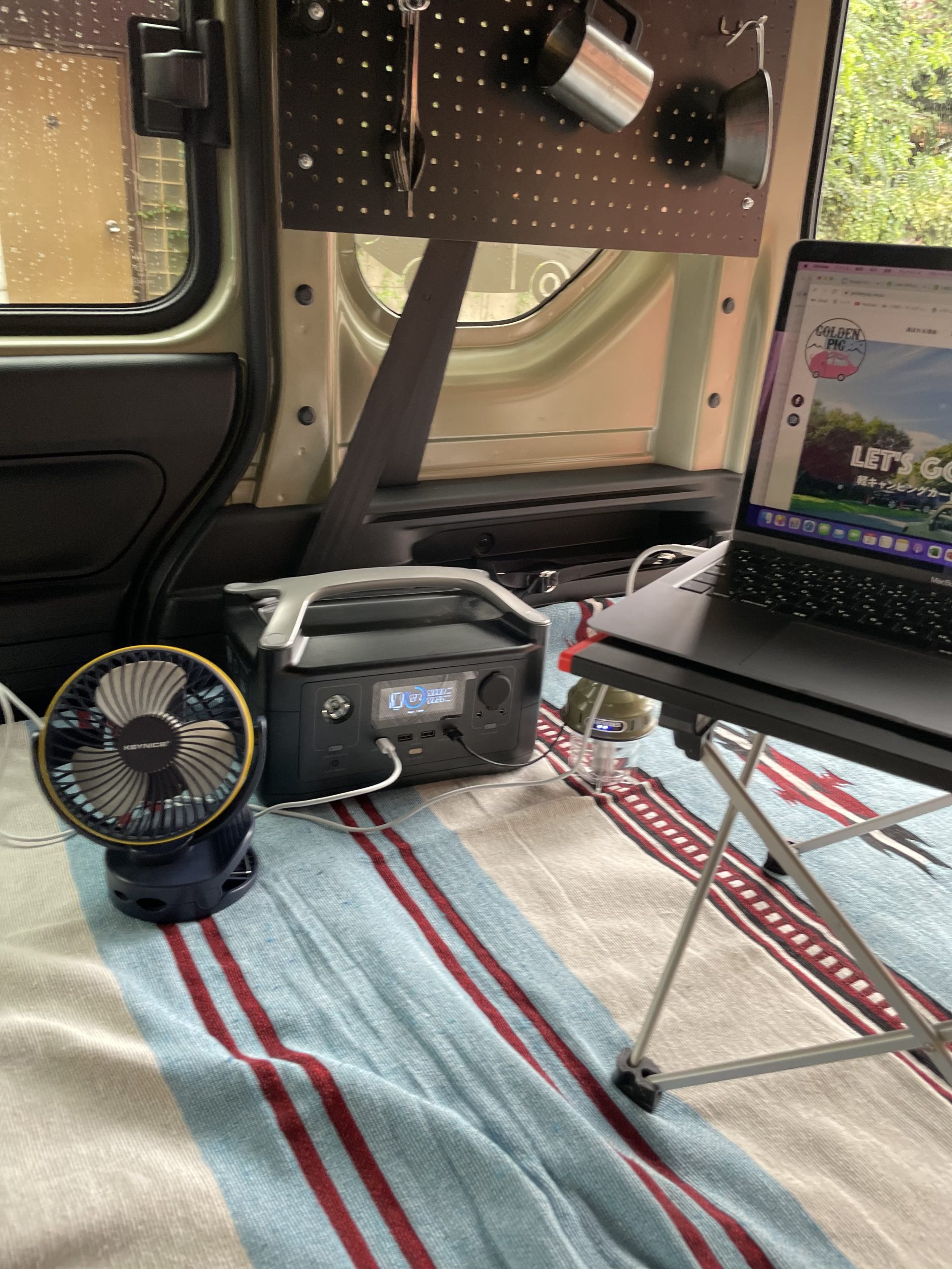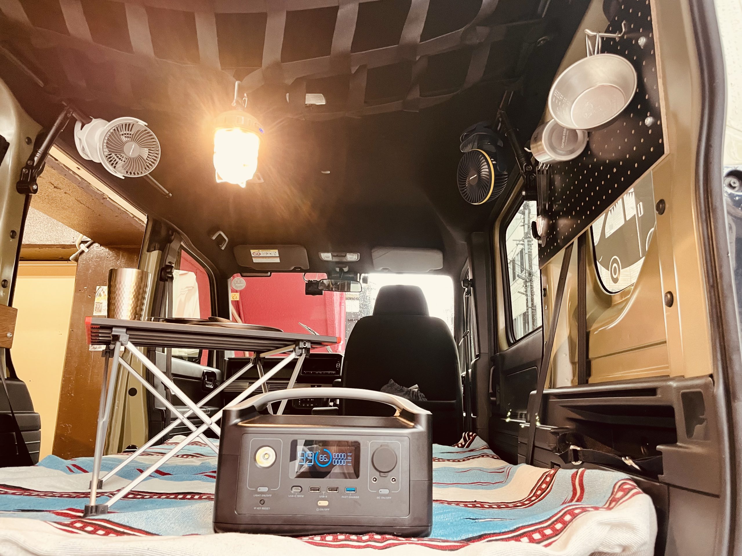 車中泊仕様N-VANの車内スペース内でも無理なく使え、外への持ち出しも簡単にできるコンパクトなポータブル電源をチョイスしました。