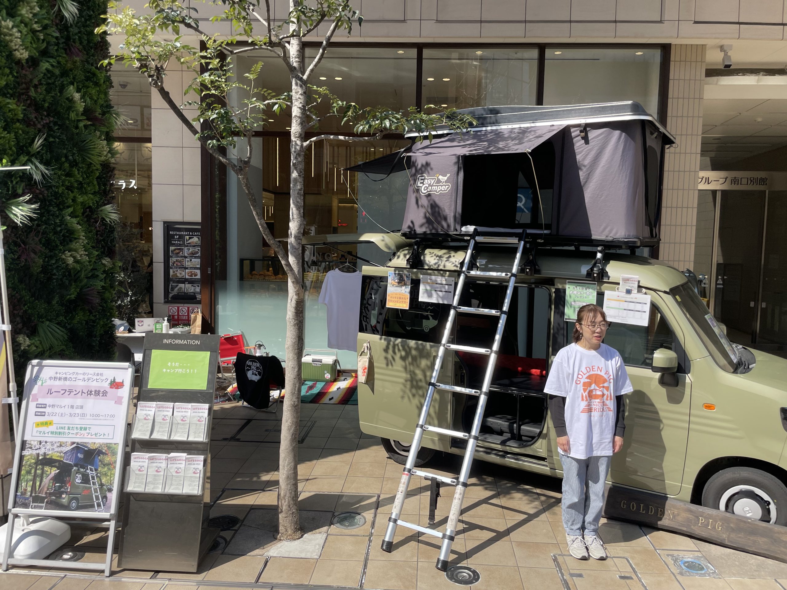 当イベントでゴールデンピッグは、ルーフテント搭載軽キャンピングカーのN-VANツリー号を中心に、レンタルキャンプ用品の展示をさせていただきました。