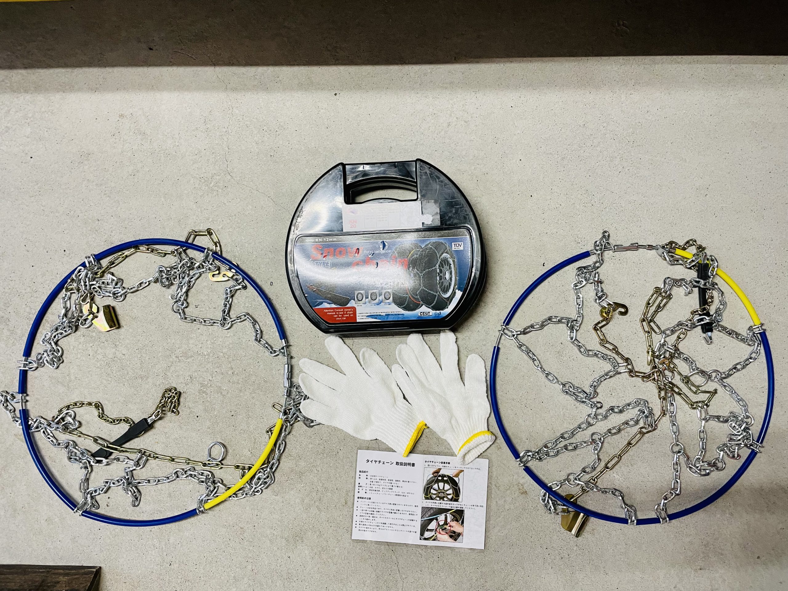 チェーンx 2、収納バッグx 1、軍手×1、取扱説明書。