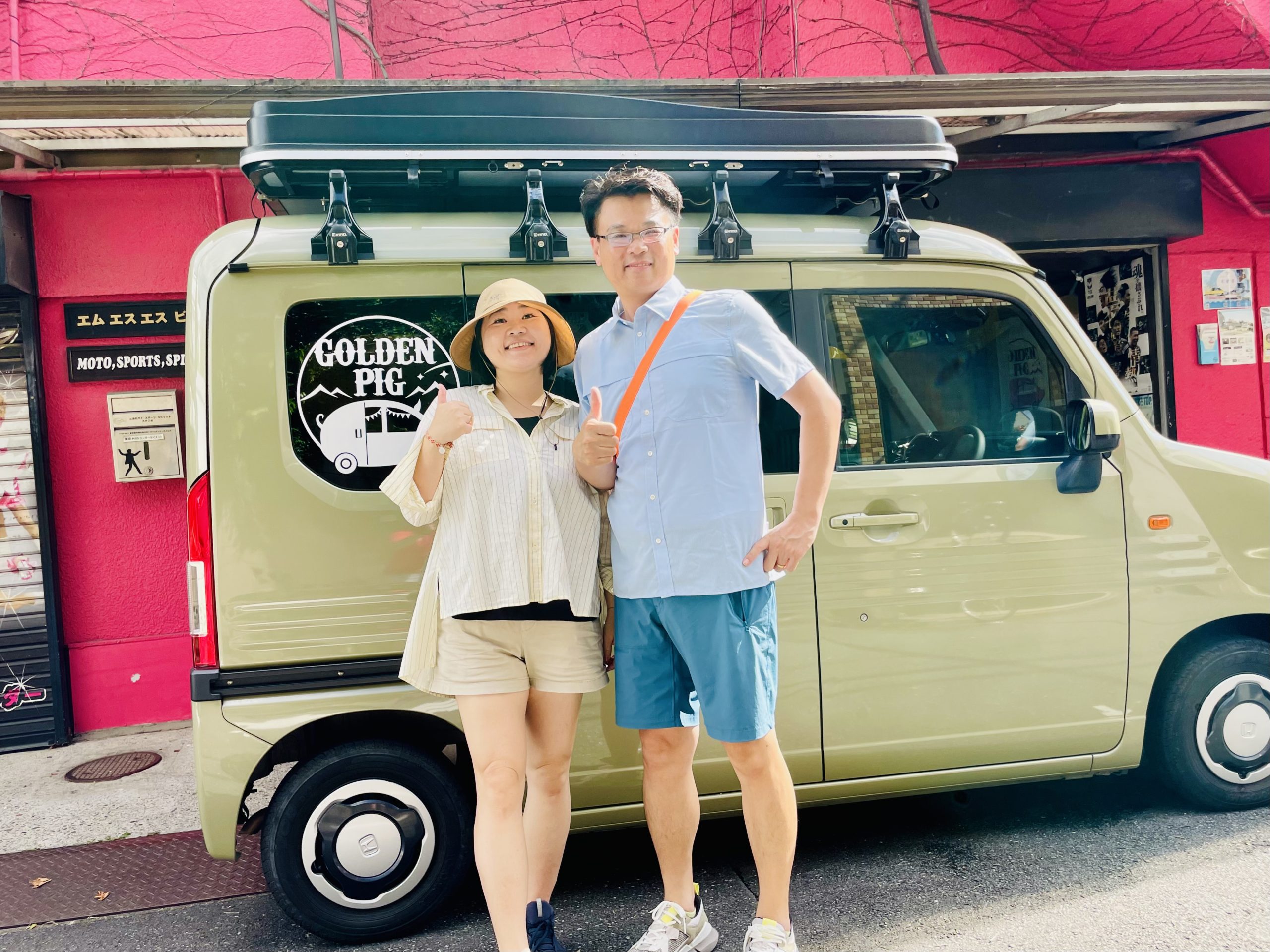 台湾から日本にお二人でいらしたお客様。日本での初めてのオートキャンプにゴールデンピッグのレンタカーを利用していただきました。