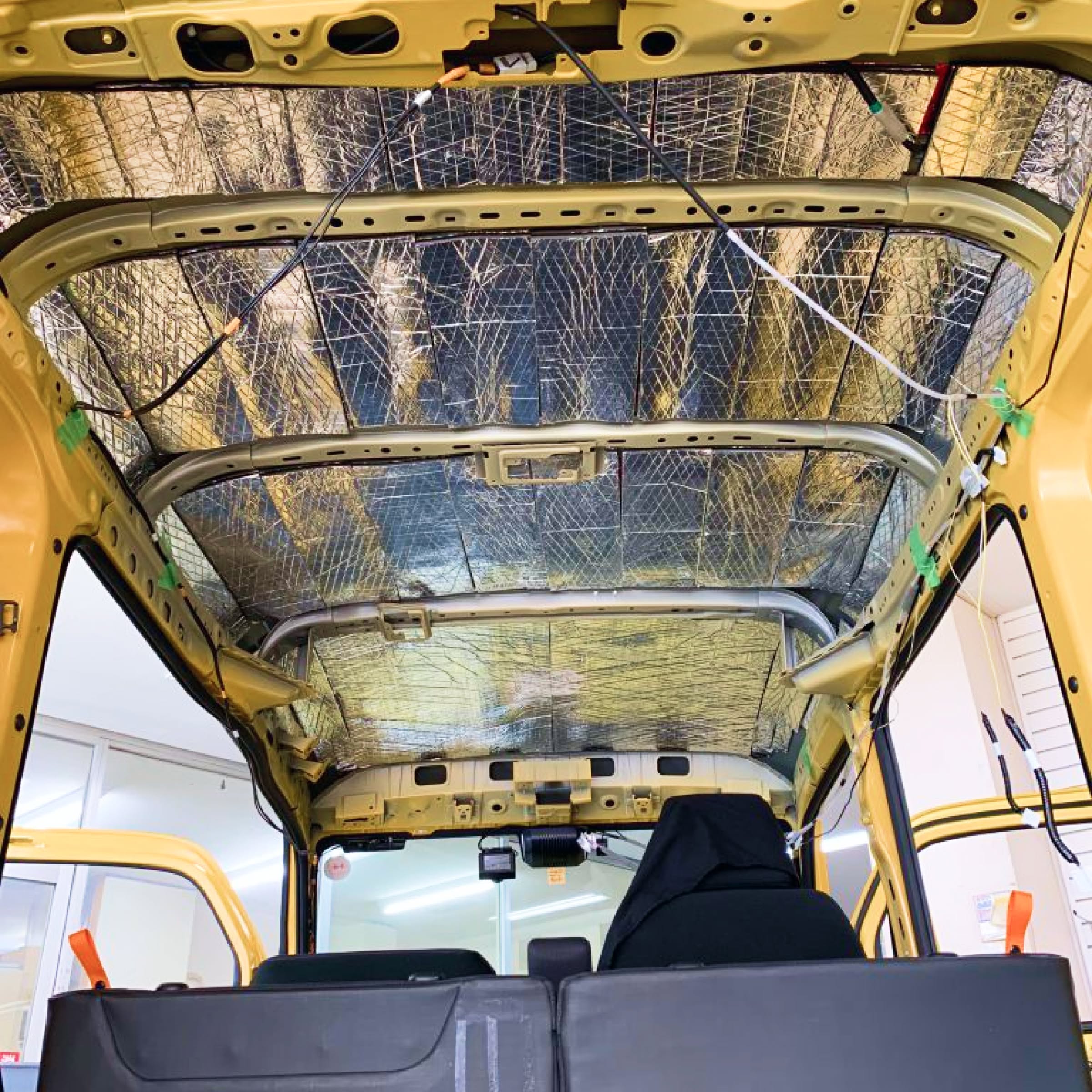 ルーフには、12枚の制振材もいれ、その上から遮熱防音材を貼り、雨音低減+断熱効果抜群の2枚重ね、雨音や不要なノイズ低減、断熱施工を行います。